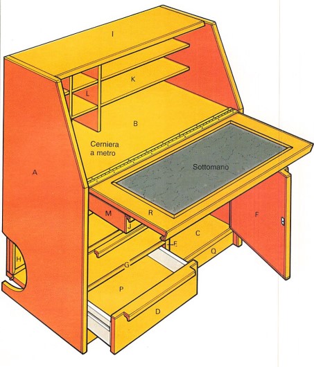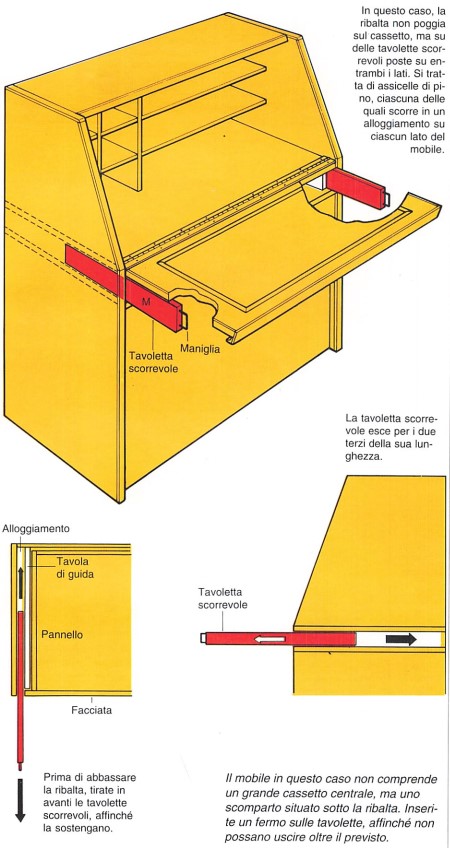 La ribalta R è articolata sul pannello intermedio B tramite una cerniera a metro,è meglio tagliarla solo quando il mobile è finito, per adattarla perfettamente ai fianchi. Si apre per mezzo di un profilo incollato su un listello, che funge da maniglia, come per i cassetti. Tuttavia, il bordo superiore della ribalta è tagliato di sbieco, affinché risulti allinealo con il pannello superiore, quando è in posizione chiusa.
