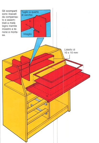 Il casellario è costituito da scomparti di diversa grandezza per l’archiviazione dei documenti. In compensato di 6 mm, é assemblato a croce a metà legno tramite incastro a tenone e mortasa. Dovrete quindi realizzare degli intagli di 6 mm di larghezza per 125 mm di lunghezza. Utilizzate uno scalpello, dopo aver segato da parte a parte con un saracco a dentatura fine, oppure con una sega circolare. Fissate quindi i ripiani su listelli inchiodati sui fianchi. La parte superiore dei montanti è tagliata per lasciar posto alla modanatura a quarto di cerchio.