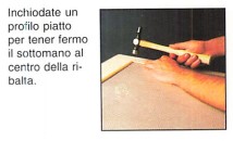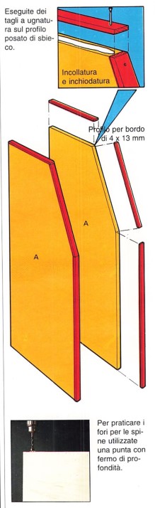Tutti i bordi delle facce a vista sono protetti con profili a sezione rettangolare di 4 x 13 mm, incollati e inchiodati sui bordi di A, B, C, G e I. Praticate i fori per le spine nei bordi dei pannelli.