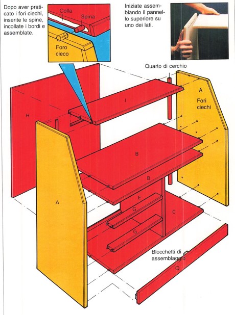 Tutti gli elementi che costituiscono la pane centrale del mobile sono assemblati sui lati con spine, tramite incollatura. Iniziate assemblando il divisorio E sui due pannelli B e C. Quindi montate tutte le parti orizzontali sui lati. Bloccate il tutto tra il muro e un mobile pesante, in attesa che la colla si essicchi. In precedenza, avrete verificato che tutti gli angoli siano perfettamente diritti. Il retro, un pannello di masonite dura di 4 mm. deve quindi essere montato sul mobile; incollatelo su una battuta riportata costituita da modanature a quarto di cerchio incollate e inchiodate. Lo zoccolino Q é assemblato con tre blocchetti di assemblaggio. Praticate con cura tutti i fori per le spine (di 30 x 6 mm). Utilizzate una guida o una punta con fermo, dopo aver localizzato i punti di riferimento con delle bussole di marcatura.