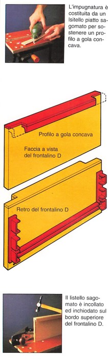 I frontalini dei cassetti sono ricavati da compensato di 12 mm. L’impugnatura è costituita da due elementi incollati: un listello piatto sagomato ed un profilo a gola concava. Sul retro del frontalino si fissano gli elementi del cassetto.