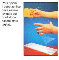 Per realizzare un porta spazzolini in vetro acrilico, ricoprite la lastra con un foglio di alluminio per esporla al calore. Potrete in tal modo piegarla facilmente. Prime di fissare i ripiani e Io specchio, applicate lo smalto. Iniziate levigando tutte le superfici e spolverandole. Scegliete uno smalto poliuretanico o gliceroftalico che applicherete con il pennello. Passate una mano di fondo e due di finitura. Potrete levigare tra ogni mano. Lo specchio è fissato tramite staffe per vetro avvitate.