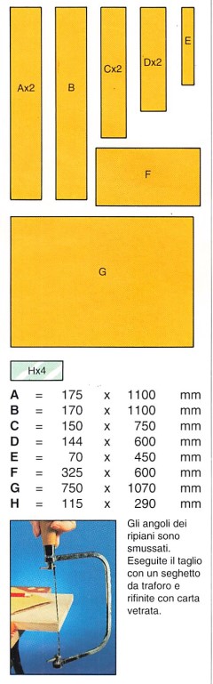 Tutti i pezzi sono tagliati da un pannello di compensato di 15 mm di spessore. Il fondo G è un pannello di masonite di 5 mm. I ripiani H sono in vetro o vetro acrilico.