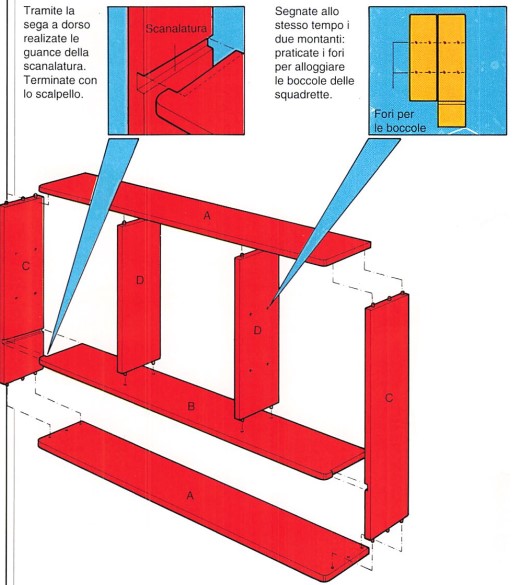I ripiani sono in vetro o in vetro acritico; potrete metterti all’altezza desiderata praticando dei fori a varie altezze sui montanti. Gli assemblaggi sono facili da realizzare perché si tratta di spine; utilizzate una guida per forare bene al centro dei bordi. La scanalatura, per il ripiano centrale, può essere realizzata tramite la fresatrice o la sega e lo scalpello.