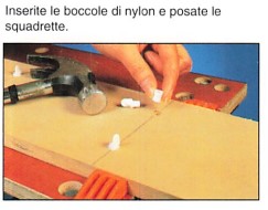facce a vista. Per praticare i fori destinati ad alloggiare le boccole delle squadrette, segnate mettendo i montanti uno di fianco all’altro. Tutti questi fori ciechi sono realizzati tramite il trapano elettrico dotato di una punta con anello di profondità. La scanalatura è un po’ più delicata da sagomare. Dopo aver eseguito il tracciato, tagliate le guance tramite la sega a dorso e terminate con lo scalpello (l’utilizzo di una fresatrice o di una fresa montata su trapano facilita il lavoro).