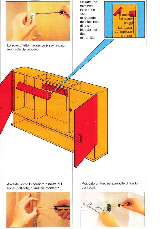 Le ante sono fissate con cerniere a metro che si tagliano nella lunghezza giusta. Sono prima avvitate sui bordi mediante piccole viti in ottone, e quindi sui montanti (abbozzate con il punteruolo).