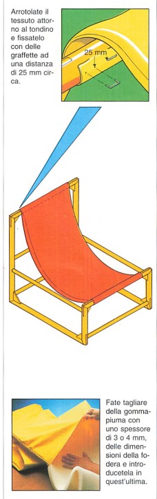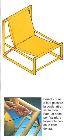 Per realizzare la seduta e per conferire allo schienale una buona tenuta, rendendolo allo stesso tempo più confortevole, fissate una corda di nylon di circa 2 m ed agganciatela negli angoli inferiori sul retro. Fatela poi passare all’interno della stoffa, in modo che non sia visibile, sopra la gommapiuma. Per poterla fissare saldamente ai cunei, realizzate dei fori in questi ultimi e fatevela passare: basterà un nodo per tenerla in posizione.